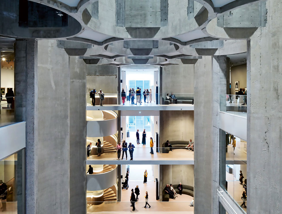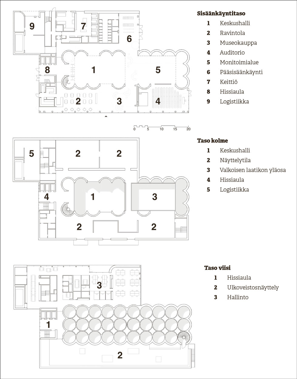 Näyttelytilat ympäröivät keskushallia toisessa, kolmannessa ja neljännessä kerroksessa. Viidennessä kerroksessa on ulkoveistosnäyttely sekä hallinnon tiloja.