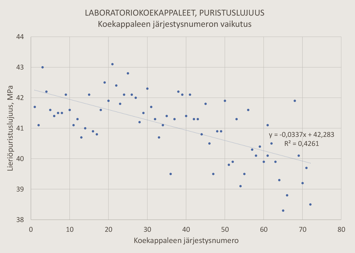 Valettaessa varsin suuri määrä koekappaleita yhdestä betoniannoksesta potentiaalisena riskinä on, että viimeisinä valmistetut koekappaleet voivat poiketa jossain määrin alkuvaiheen koekappaleista. Tätä on analysoitu kuvassa 1, jossa on esitetty puristuslujuus koekappaleen järjestysnumeron funktiona. Kuvan perusteella voidaan arvioida, että lujuustaso laski jossain määrin järjestysnumeron mukaan. Ero alku- ja loppupään koekappaleiden välillä ei ole suuri, mutta korrelaatio on selkeä. Lineaarisen regression selitysasteeksi R2 saadaan 0,4261. Tämä tarkoittaa, että yli 42 % koekappaleiden hajonnasta johtui järjestysnumerosta. Regressioyhtälön mukaan ensimmäisen ja viimeisen koekappaleen puristuslujuuksien ero olisi 2,4 MPa. Koekappaleet jaettiin osallistujille niin, että kaikki saivat sekä alku- että loppupään järjestysnumeroita ja siten edellä mainittu lujuusvaihtelu ei vaikuttanut merkittävästi tasokokeen tuloksiin.