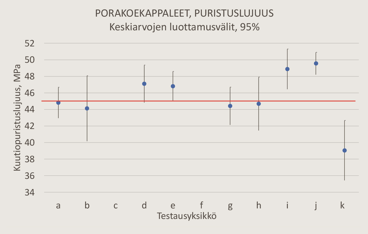 Tasokokeessa yksittäisten tulosten virhemarginaali oli -7,4 MPa…+5,2 MPa 95 %:n varmuustasolla. Mitatut suurimmat yksittäiset tulosten poikkeamat koko populaation keskiarvosta olivat -9,18…+5,99 MPa. Kuvien 5 ja 6 perusteella voidaan helposti arvioida, että testausyksiköiden välillä on tilastollisesti merkittäviä eroja. Keskiarvon luottamusvälit eivät mene kaikilta osin ristiin eli joidenkin yksiköiden alhaisimmat koetulokset olivat korkeampia kuin joidenkin toisten suurimmat koetulokset.