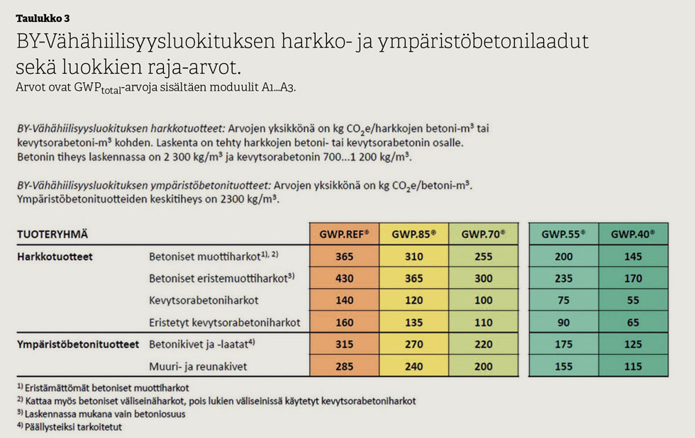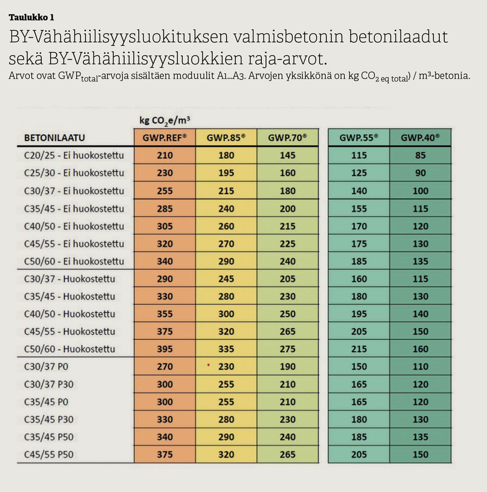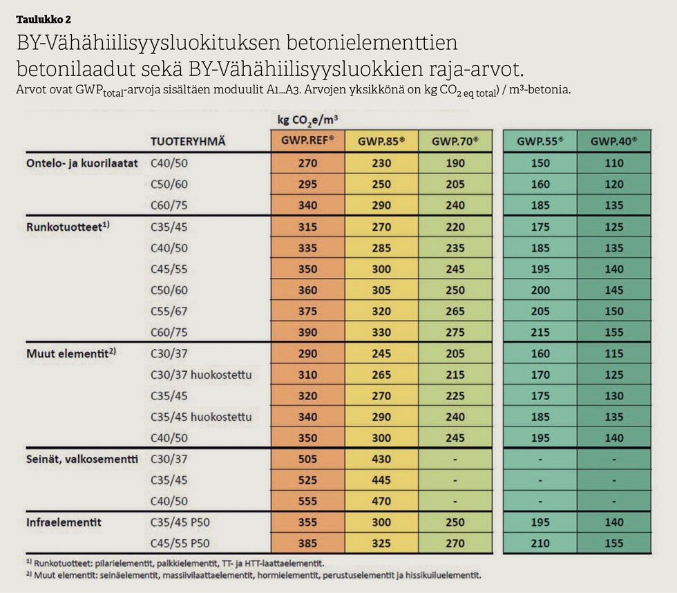 Hiilidioksidipäästöjen vähentäminen rakennetussa ympäristössä on ensisijaisen tärkeää. Päästövähennysten osalta rakennusalalla on merkittävästi säästöpotentiaalia. Betoniyhdistyksen ylläpitämä BY-Vähähiilisyysluokitus® on vapaaehtoinen, kansallinen luokitus betonin CO2-päästöjen ilmoittamiseksi. Luokituksen tarkoituksena on luoda alalle tuotemerkeistä riippumaton, yhtenäinen tapa kuvata erilaisia vähähiilisempiä betonilaatuja, joilla voidaan vähentää betonin valmistuksen aiheuttamia hiilidioksidipäästöjä.