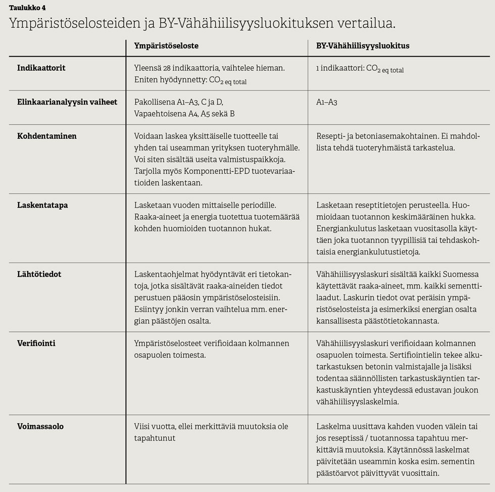 Muistiossa todetaan, että alan kehittämää vapaaehtoista laskentamenetelmää voidaan käyttää sellaisille rakennustuotteille, joissa tuotteiden kirjo on niin suuri, ettei niille ole tarkoituksenmukaista laatia tuotekohtaisia ympäristöselosteita. Muistossa todetaan myös, että ympäristöselosteet toimivat esimerkiksi betonin osalta varsin huonosti, sillä betoniasemalla voi olla satoja betonilaatuja. Tämän takia Suomessa on laajassa käytössä esimerkiksi Suomen Betoniyhdistys ry:n ylläpitämä vähähiilisyysluokitus.