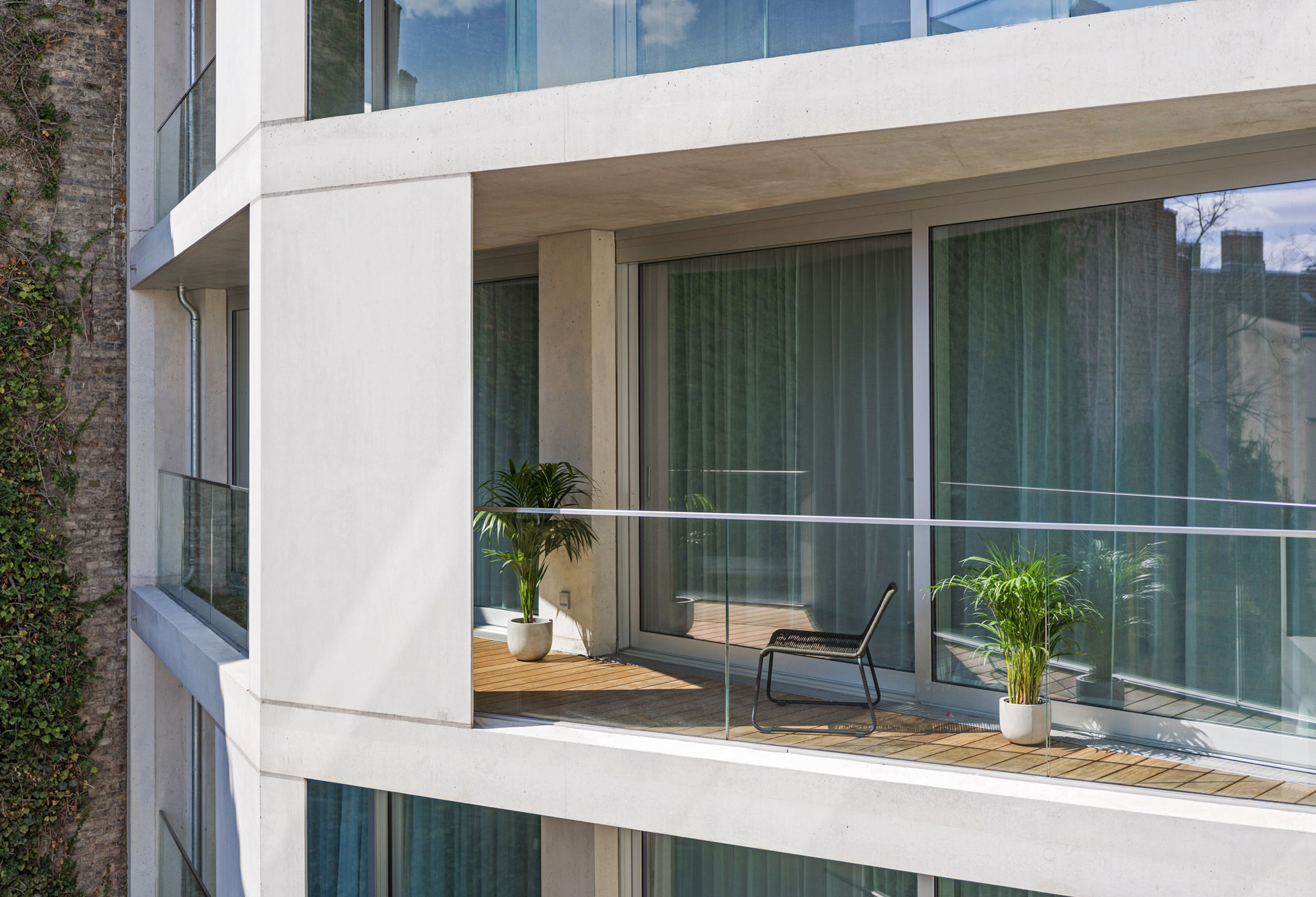 Rakennuksen varsinainen runko on paikalla valettua betonia. Katujulkisivu on rakennepaksuudeltaan noin 50 cm lämpöä eristävää kevytbetonia. Kadulle avautuvat suuret puualumiini-ikkunat. Lisää elävyyttä julkisivuun tuovat asuinkerrosten suurten, ikään kuin taulunkehysten ympäröimien ikkunoiden ulkopuolella sijaitsevat liukusäleiköt.