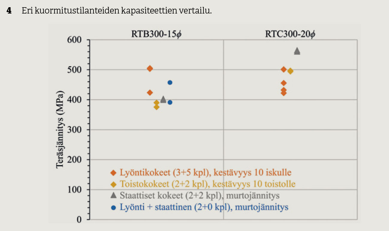 Koekappaleiden kestävyyksien välisen vertailun osalta haasteena oli, että kokeista ei tuloksena suoraan tule varsinaista murtoarvoa, vaan varsinkin lyöntirasitettuihin paaluihin toistoja tulee huomattavan vaihtelevilla vetojännityksillä ennen murtoa. Koekappaleiden keskinäisen vertailtavuuden mahdollistamiseksi kunkin koekappaleen kuormitushistoria sovitettiin Model Code 2010 [4] mukaiseen betonin vetorasitusten väsymismalliin, jonka perusteella arvioitiin pääterästen vetojännitys, jollaisia koekappale kestäisi kymmenen toistoa.
