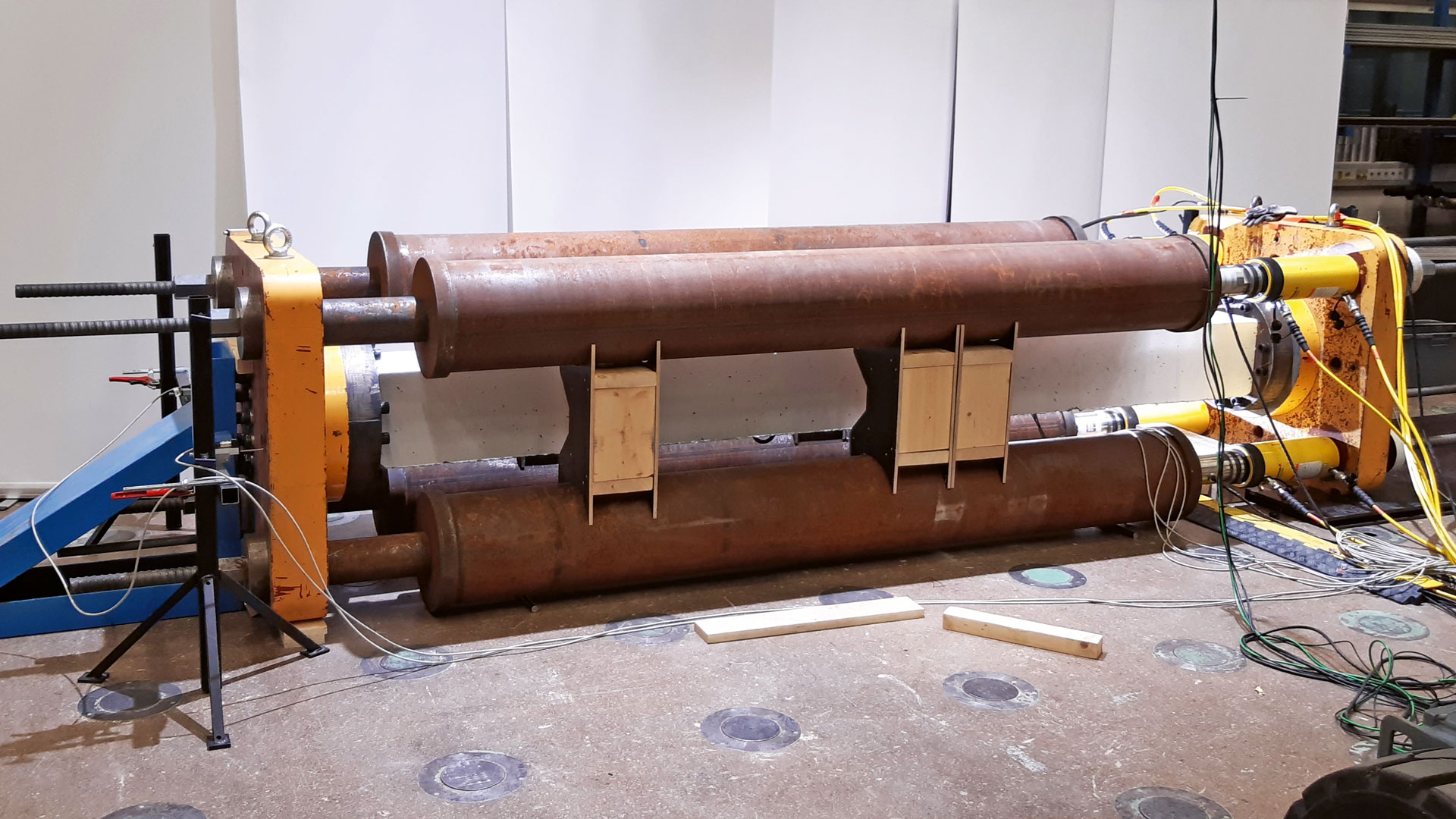 Vetokokeet toteutettiin tutkimusta varten modifioidussa kuormituslaitteessa (kuva alla), jossa voima tuotettiin neljällä hydraulisylinterillä. Kokeen aikana koekappaleen muodonmuutoksia mitattiin raudoitetankoihin asennetuilla venymäliuskoilla ja paalun pinnasta digitaalisella kuvakorrelaatiomittauksella (DIC-mittaus).