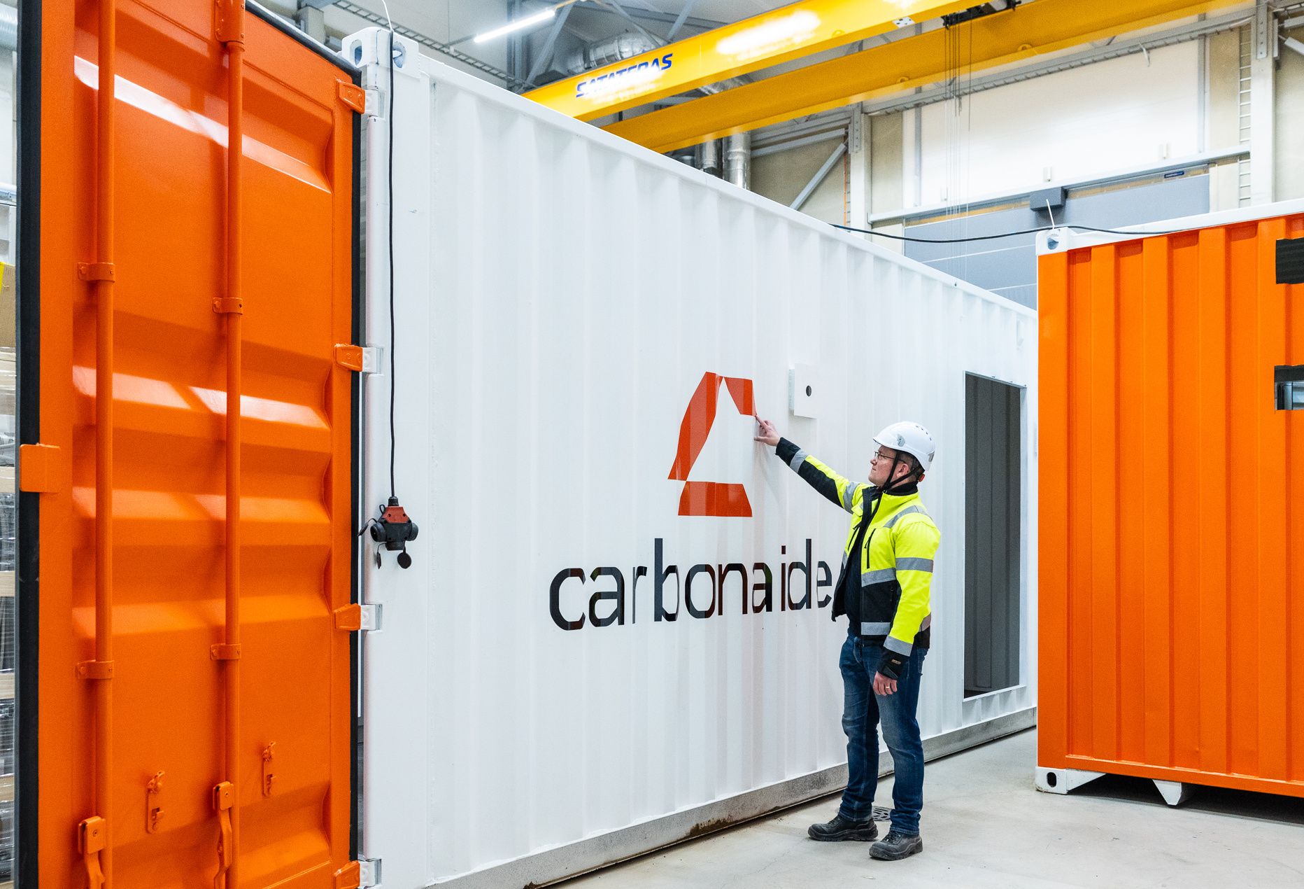 Carbonaiden teknologia voidaan rakentaa kuljetuskonttiin. Kuvassa yhtiön COO Jonne Hirvonen. Kuva: Jarno Artika